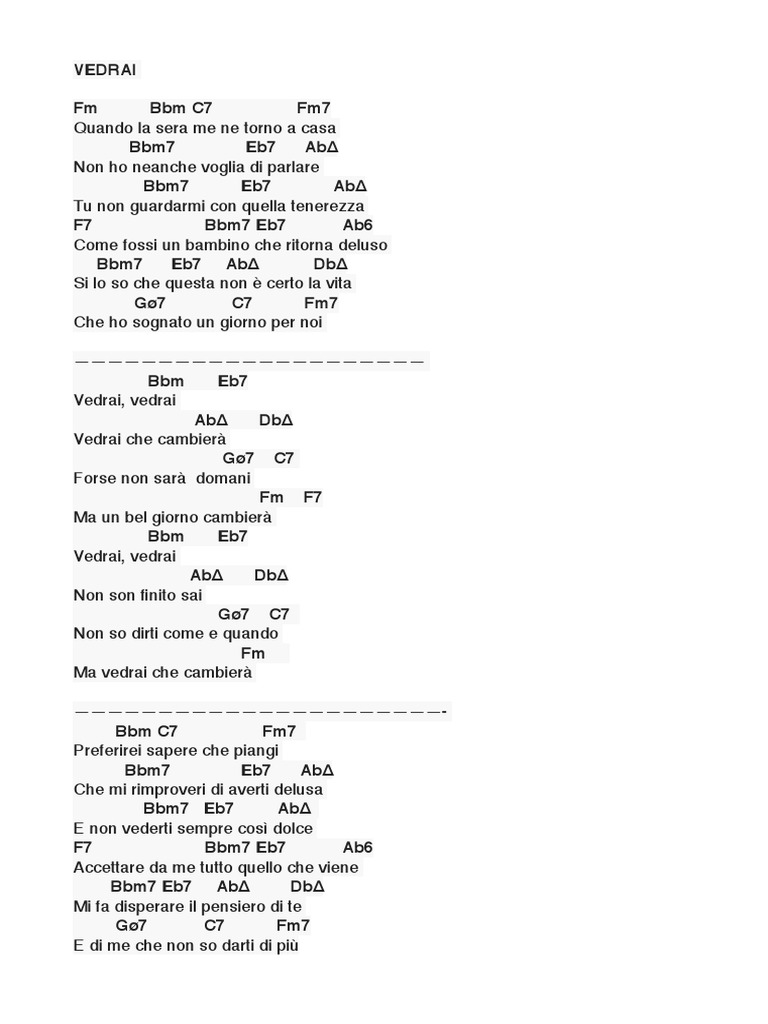Accordi Vedrai Vedrai - Aquí estoy yo Luis Fonsi - Traduzione in italiano con ... - Dm gm vedrai, vedrai, c7 f7 vedrai che cambierà, b gm forse non sarà domani, a7 dm ma un bel giorno cambierà.